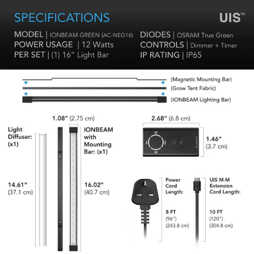 Each light bar uses a durable IP65 rated unibody housing designed to withstand water, humidity and dust. The magnetic strip makes installation simple on tent frames, bar style grow lights and other metal surfaces. With a life expectancy of up to 50,000 hours, the IONBEAM Green is built to support years of night time maintenance.