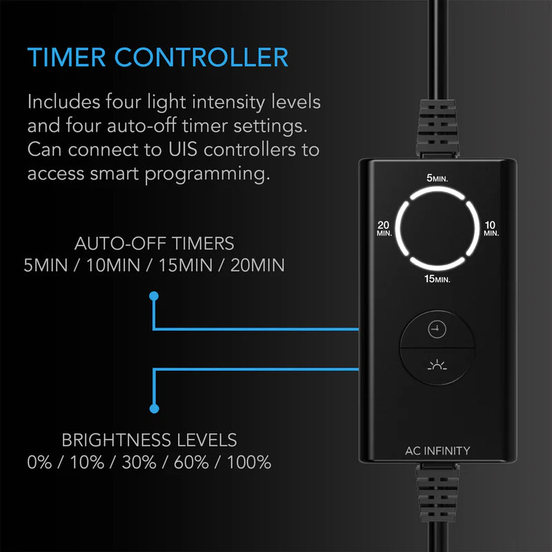 The built in dimming controller offers four intensity levels plus timer options in 5, 10, 15 and 20 minute increments. When paired with a UIS controller, the light can be managed through the AC Infinity app, allowing full integration with your existing grow equipment.