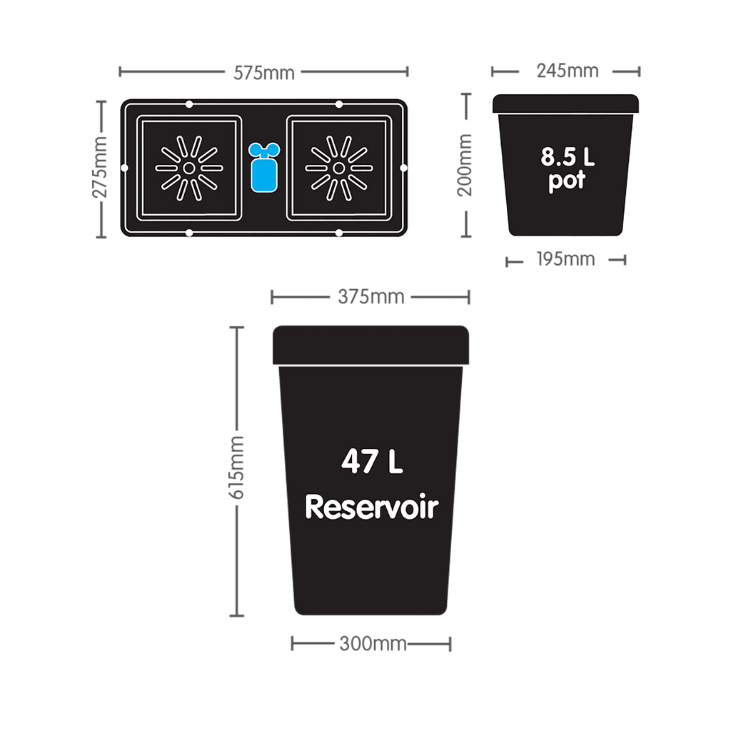 Beyond easy2grow 6 you can continue to add extra extensions to create systems of potentially infinite size, however, we recommend that you upgrade from the 47L reservoir supplied with your easy2grow Kit in order to do so.