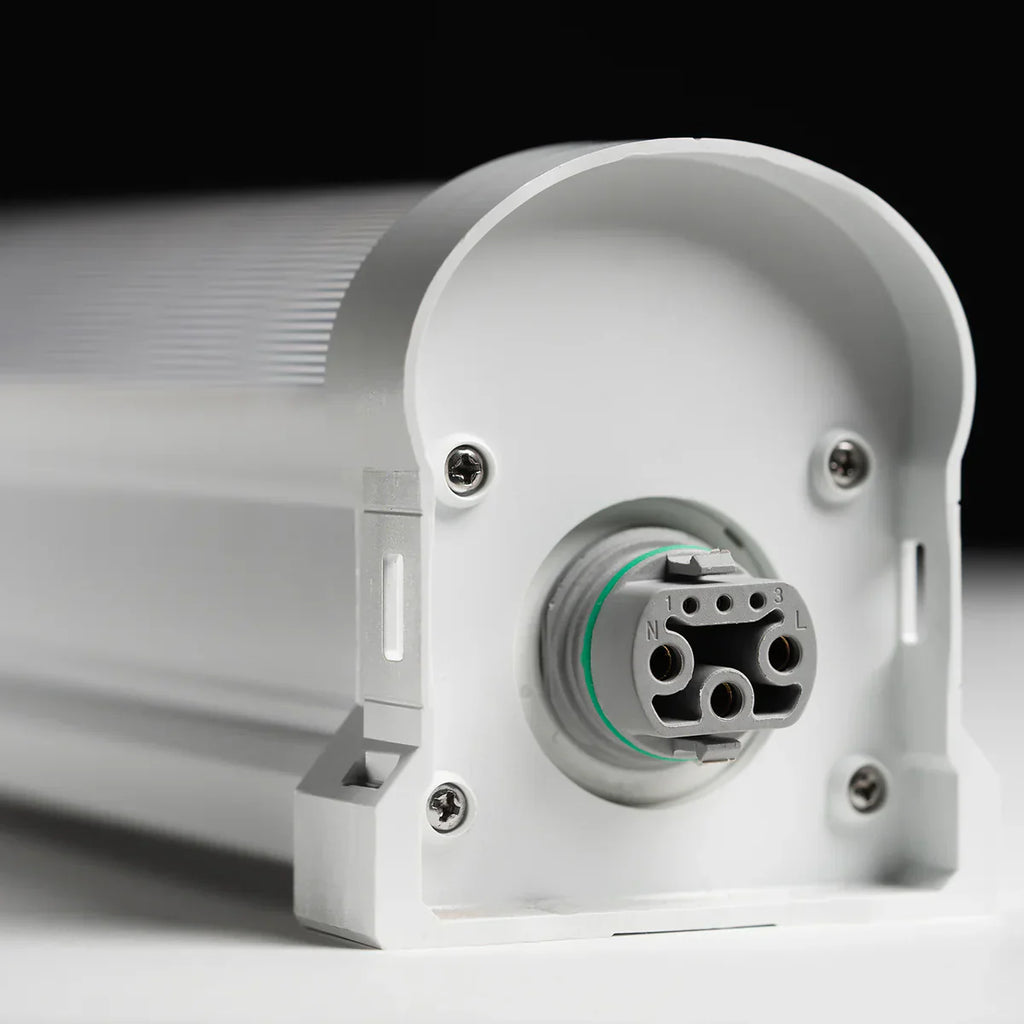 The slim 46 inch profile fits easily under benches, on racking systems and throughout lower canopy spaces. Multiple units can be daisy chained for clean wiring and scalable installs.