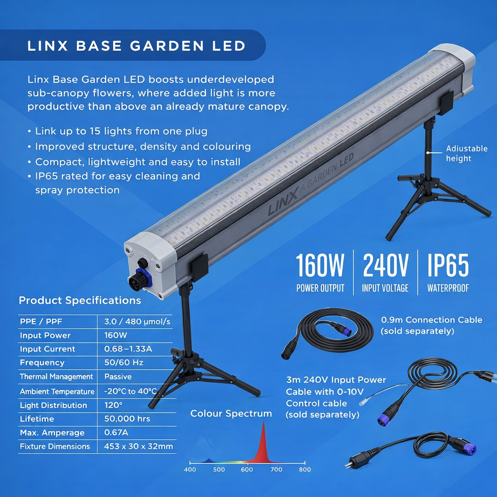 The LINX Base Garden LED is designed to sit below the main light source, directing light horizontally into lower growth zones rather than down from above. This targeted approach supports better light penetration, more even development, and improved utilisation of available space.