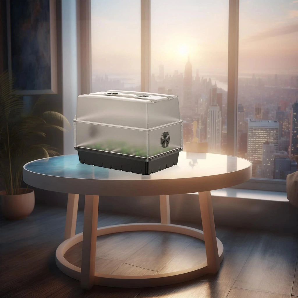 A domed germination kit designed to promote successful plant growth and propagation by producing a high humidity environment. The transparent dome allows for optimal light saturation while offering easy observation of your plants’ progress.