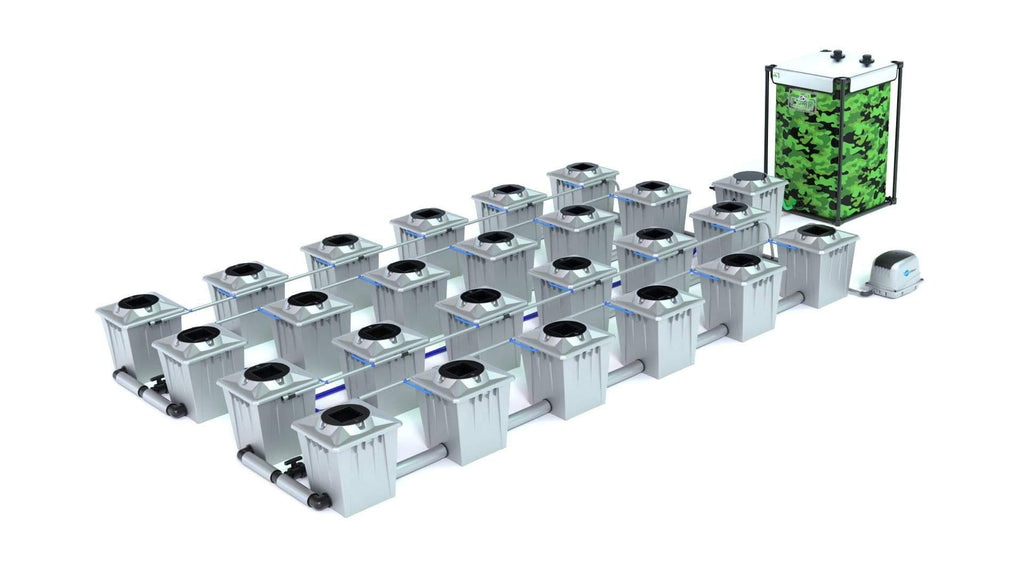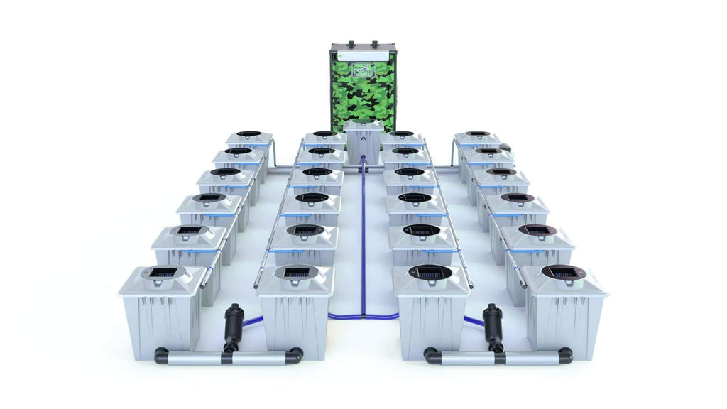 Huella mínima: Largo: 2,6m Ancho: 1,47m (Macetas lo más cerca posible - sin tanque)Huella máxima: Largo: 3,5 m Ancho: 2,15 m (con la cantidad de tubería suministrada y centros de planta de 60 cm)