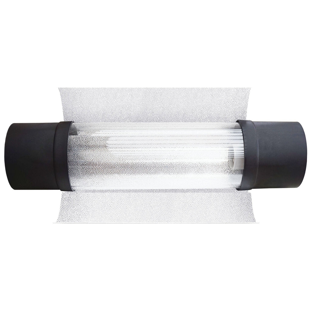El reflector Cool Wing cuenta con un tubo frío. Este tubo es un tubo de vidrio transparente, hermético y completamente sellado, con un soporte para lámpara en el centro. Su función es eliminar el aire caliente producido por las lámparas HPS y de halogenuros metálicos de forma más eficiente del cuarto de cultivo. Esto se consigue soplando aire frío a través del tubo frío y extrayendo el aire caliente del reflector. La principal ventaja del tubo frío es que se puede montar a menor altura, lo que permite que las plantas reciban más luz sin quemarse por el calor.