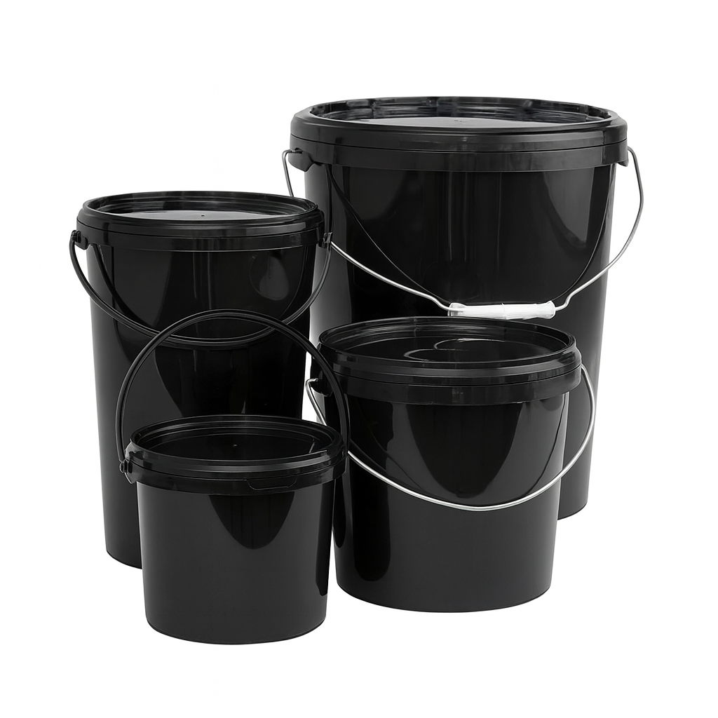 ¡Compre hoy mismo su cubo de plástico negro con tapa para un almacenamiento confiable y un transporte sin complicaciones!