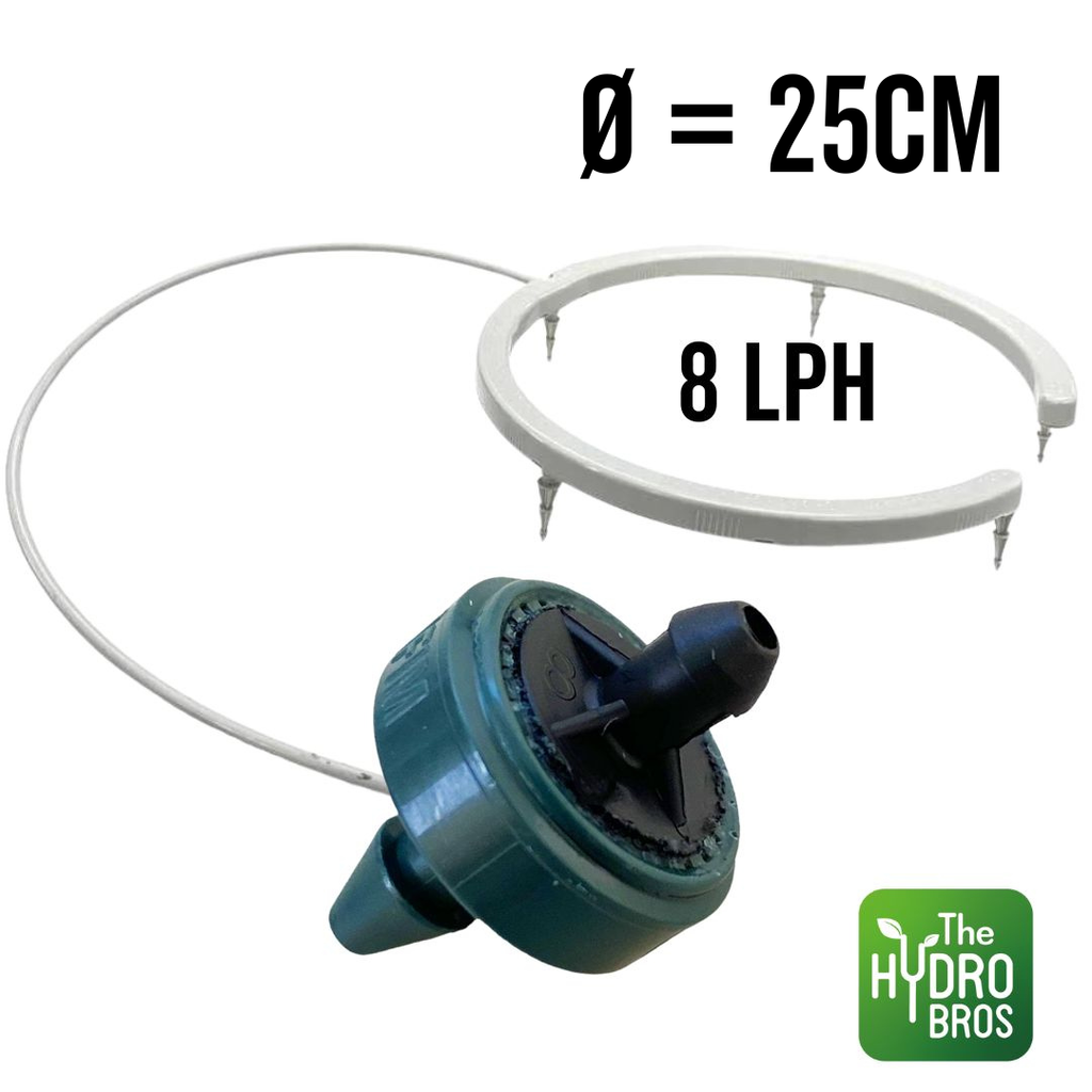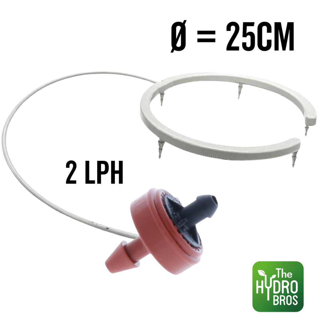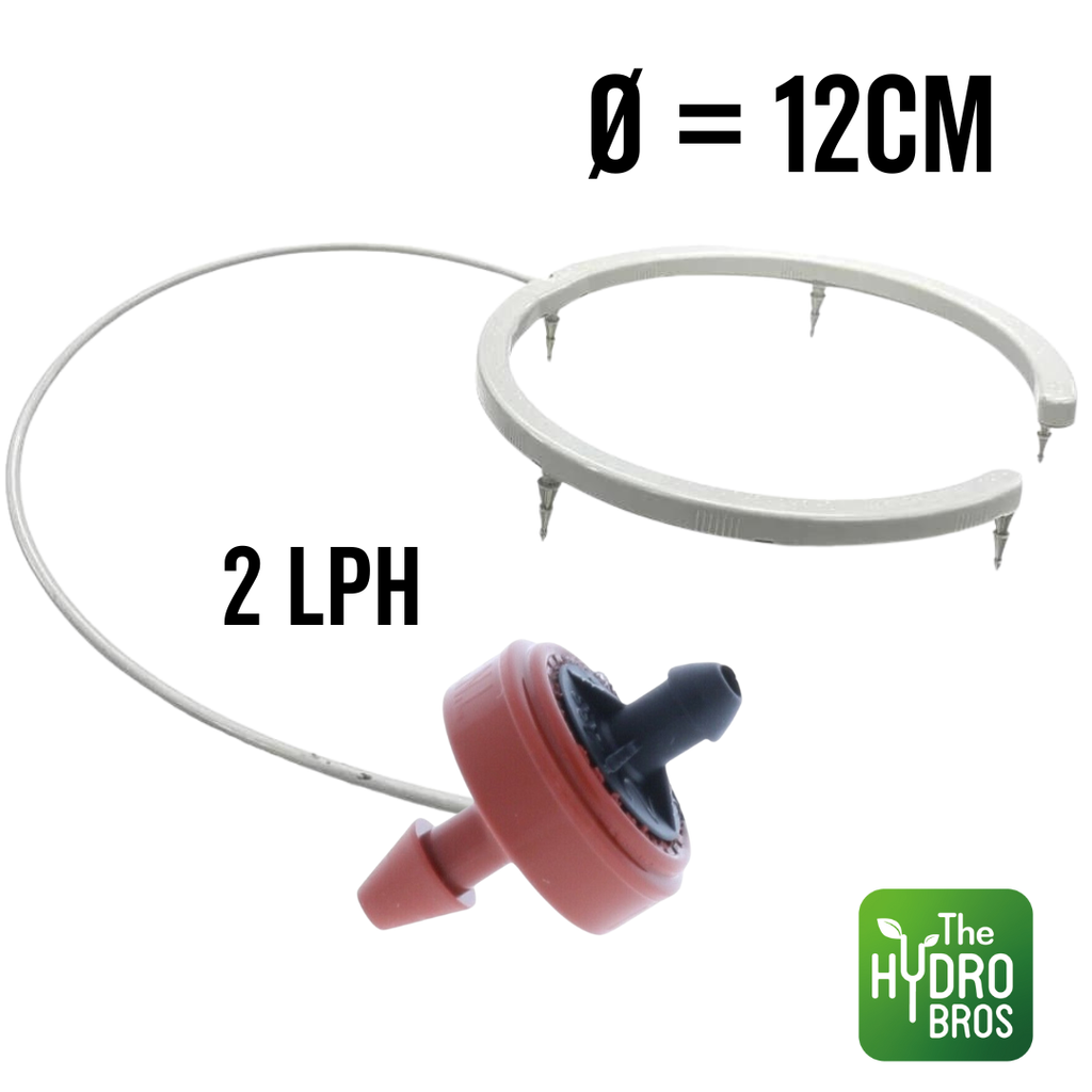 Cet anneau goutteur de 12 cm est livré avec un mètre blanc de ligne de goutteur et un CNL 2lph - le CNL est une buse de compensation sans fuite qui agit comme une passerelle entre le goutteur et la ligne de distribution pour garantir que des quantités d'eau précises et égales sont distribuées sur .