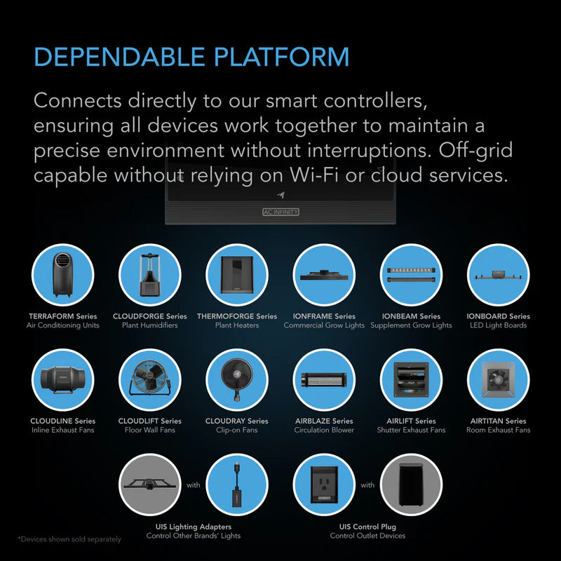 As part of the AC Infinity UIS™ ecosystem, this humidifier integrates seamlessly with the AC Infinity app over WiFi, allowing full environmental control alongside compatible fans, controllers, and climate devices.