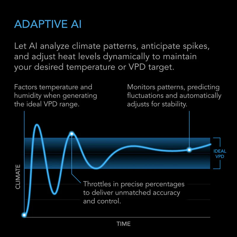 Powered by adaptive AI, the THERMOFORGE T7 continuously learns from real-time environmental data to maintain your programmed temperature and VPD targets. The system responds instantly to fluctuations, adjusting output dynamically to deliver smooth, stable conditions without temperature swings.