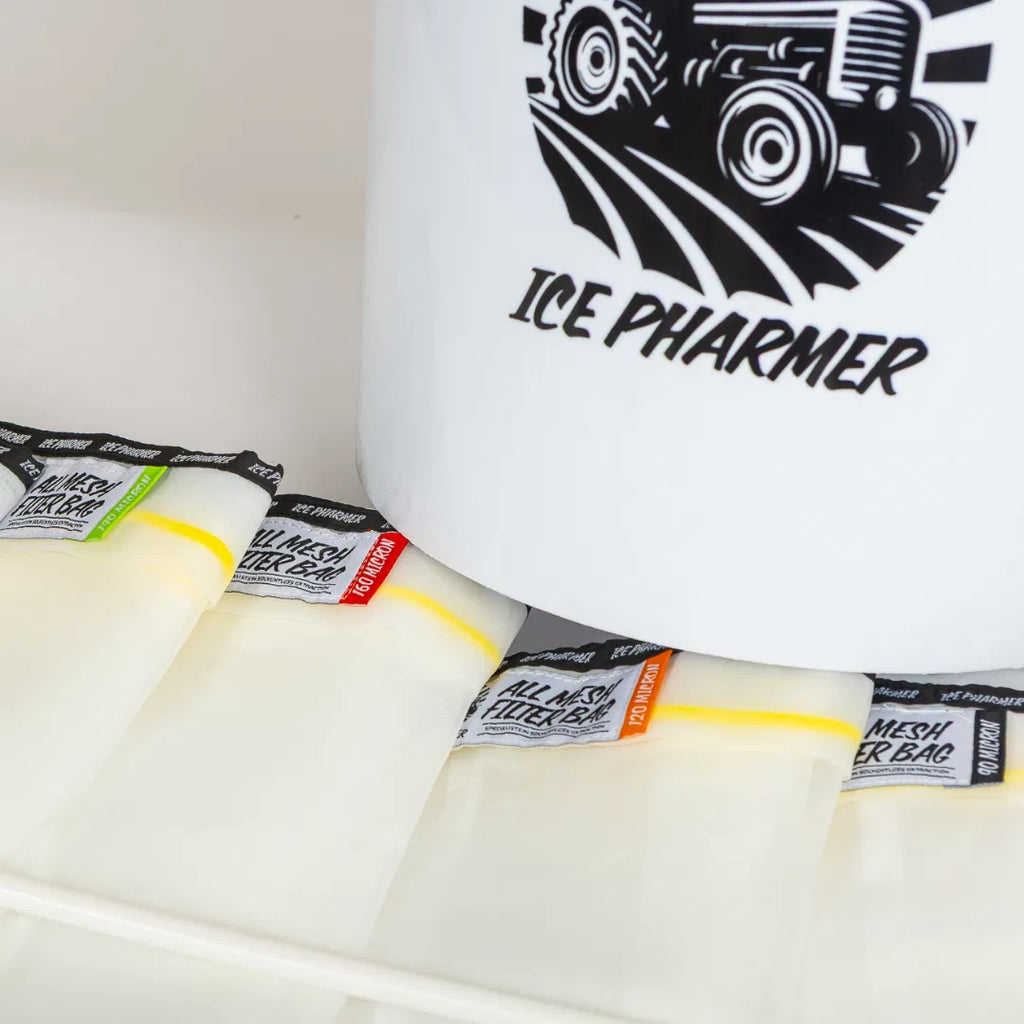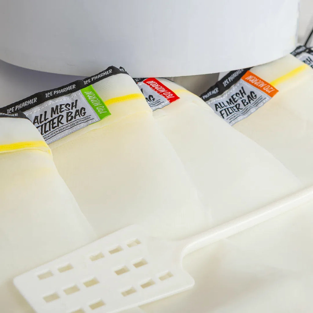 Material is gently agitated in ice-cold water using the included washing machine, helping separate desirable compounds without heat. The wash is then filtered through stacked all-mesh bags with graduated micron sizes, allowing for clean, staged separation.